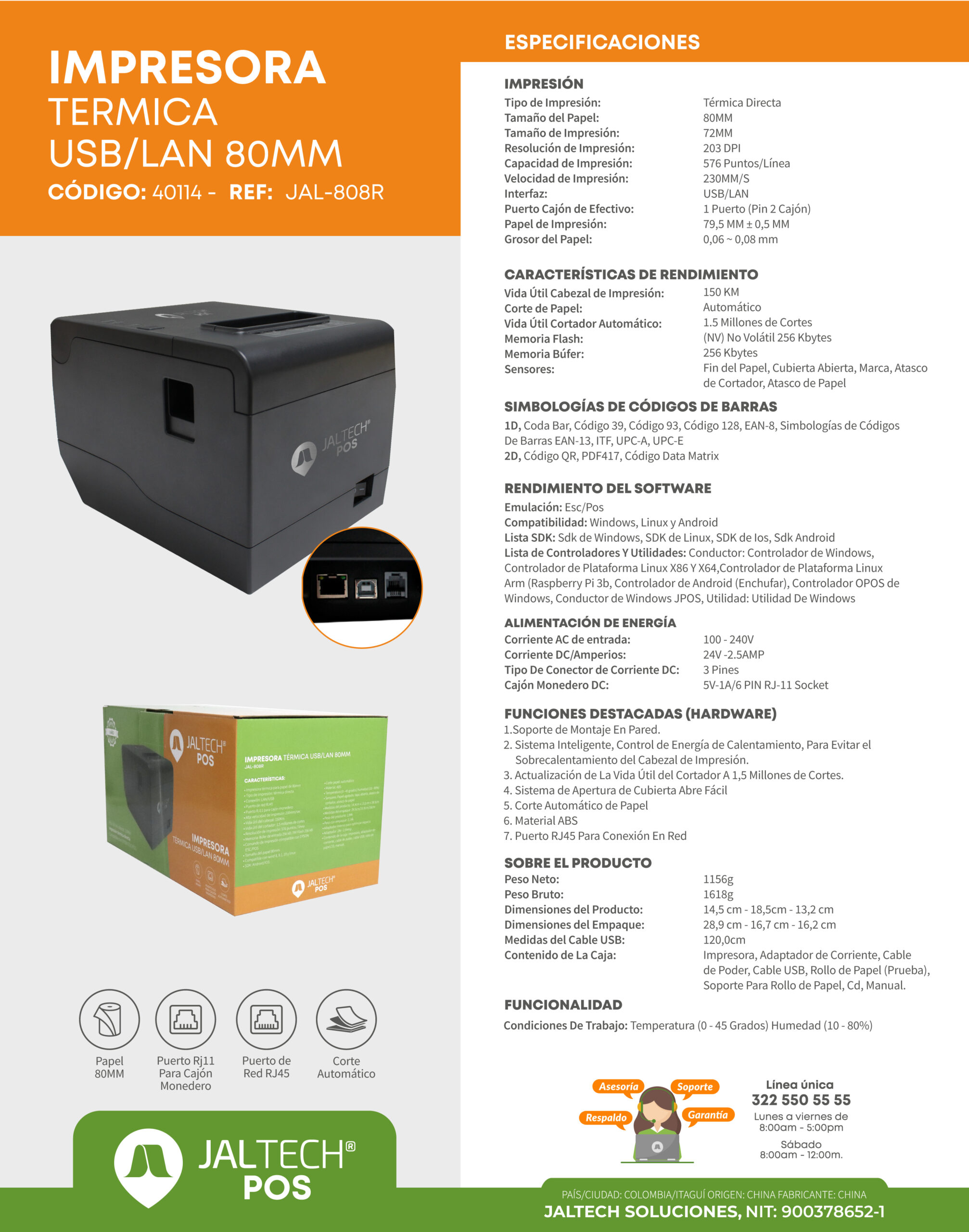 - Contenido de la caja: impresora, adaptador de corriente, cable de poder, cable USB, rollo de papel, CD, manual